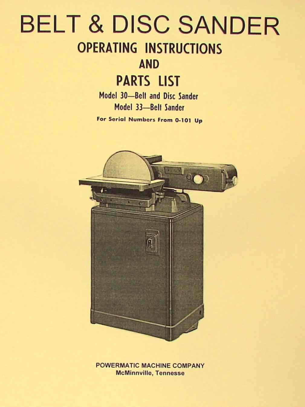 This document serves as the official Operator's and Parts Manual for the POWERMATIC Model 30 Belt & Disc Sander and the Model 33 Belt Sander. It is a reproduction of the original manual, meticulously edited for clarity and durability. This manual is essential for proper operation, maintenance, and identification of parts for your sander, covering machines with serial numbers 0-0101 and up.