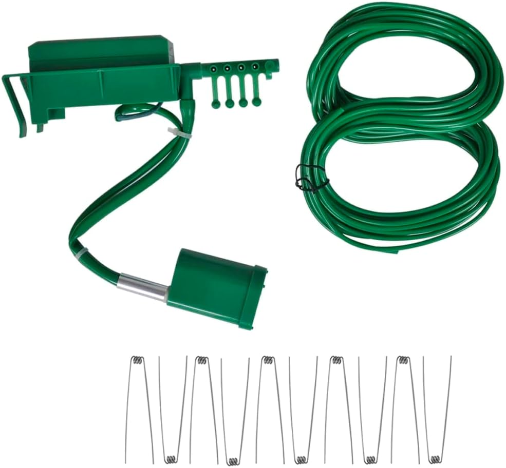 画像: 上view of the system components, showing the main control unit with pump, the 10-meter vinyl tube, and the 10 stainless steel spring pegs.