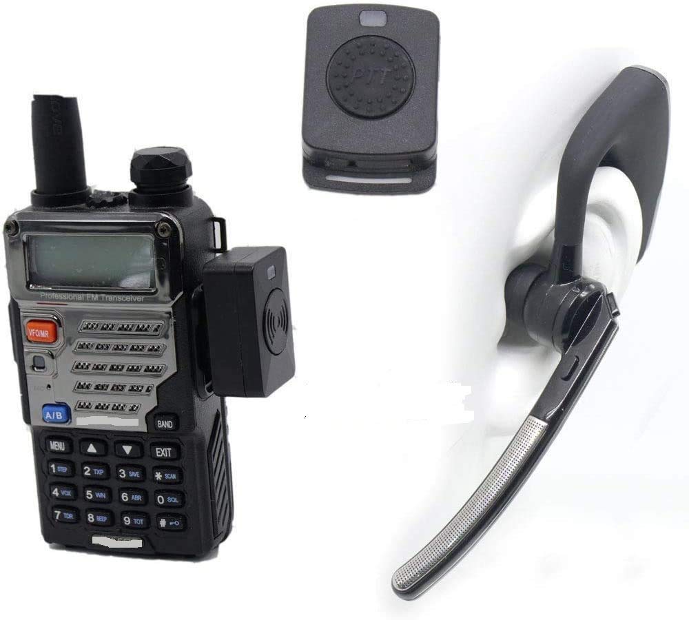 Image: A two-way radio (Baofeng UV-5RE) with the wireless adapter attached, alongside the Bluetooth headset and wireless PTT button, demonstrating a complete setup.