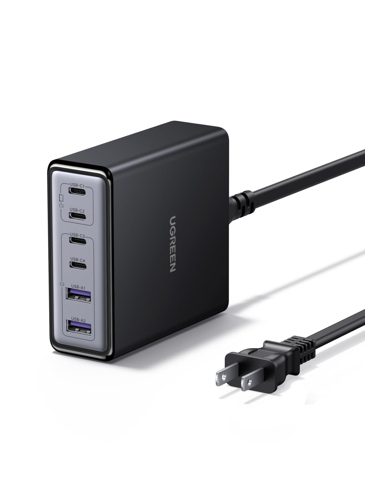 Image 1.1: UGREEN 100W GaN Desktop Charger, showcasinコンパクトなデザインと複数の充電ポートを備えています。